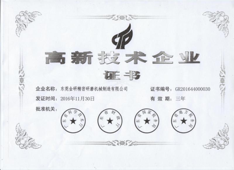 2016年11月,東莞金研精密研磨機(jī)械制造有限公司(簡稱kizi)獲得“高新技術(shù)企業(yè)”榮譽(yù)稱號。